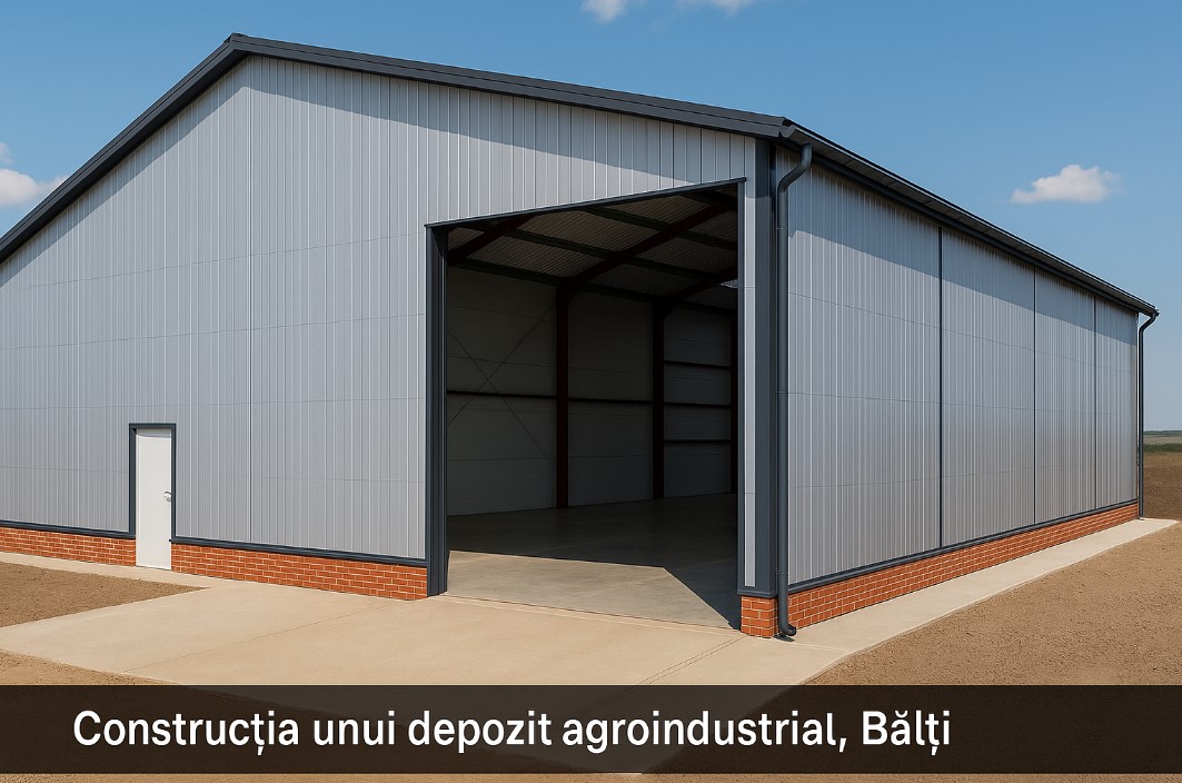Construcția unui depozit modern pentru cereale și furaje, cu structură metalică galvanizată și panouri sandwich termoizolante.